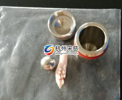 1.要先取1個大鼠的腳板放進到鋼罐里再在其添加配套設施的研磨珠。2.把含有試品的鋼罐放進到液態氮中進行冷藏。3.再把鋼罐放進多樣品組織研磨儀設備的適配器中。4.把研磨設備的參數按要求設置。5.研磨程序結束后 ,就可以獲得樣本了,如下圖所示。